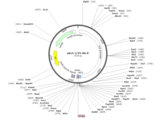 本产品为pAc5.1V5-His B质粒DNA,是具有P-AC5 (Actin 5C)启动子的果蝇表达载体,可用于以果蝇细胞为宿主的重组蛋白的高水平瞬时表达。pAc5.1V5-His B质粒DNA具有多克隆位点,方便用户在不同酶切位点插入所选基因进行研究或表达。本质粒携带Amp抗性基因。其图谱如下:
