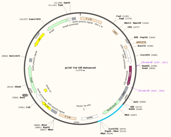 本产品为pLVX-Tet-Off Advanced质粒DNA干粉,是慢病毒载体,携带氨苄青霉素抗性基因。其图谱如下: