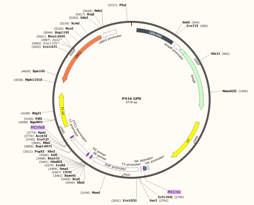 本产品为p416 GpD质粒DNA干粉,是酿酒酵母表达载体,携带氨苄青霉素抗性基因。其图谱如下: